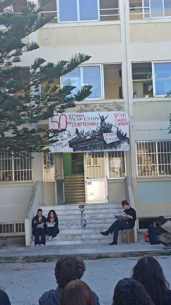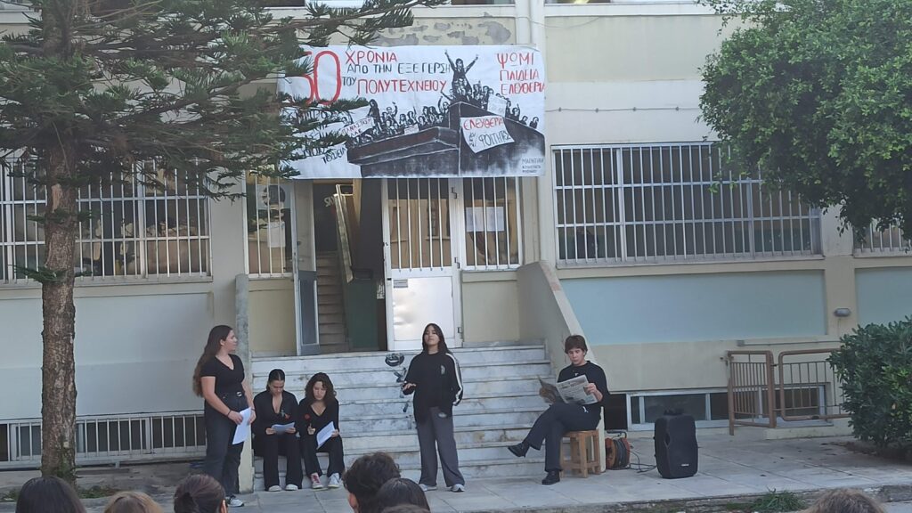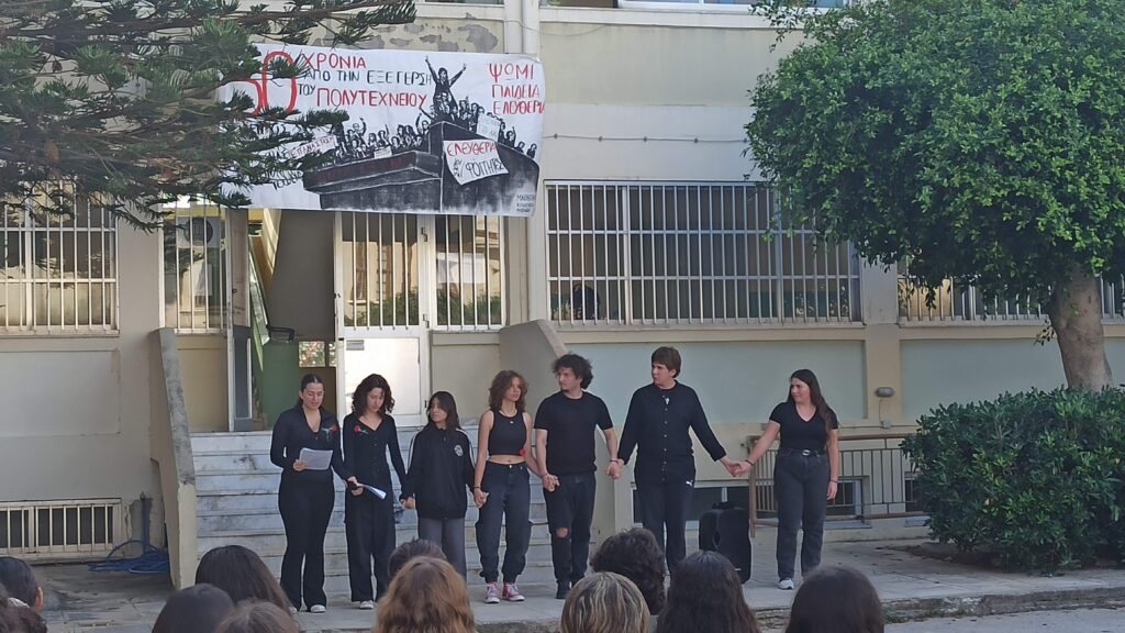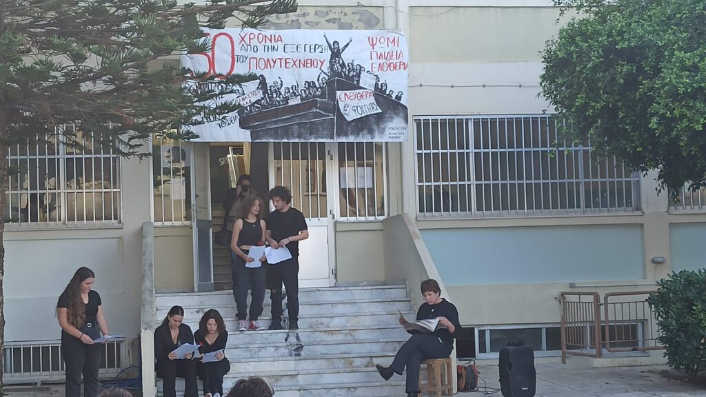 Στο Πειραματικό Λύκειο Ρεθύμνου πραγματοποιήθηκε εκδήλωση με αφορμή την επέτειο των 50 χρόνων από τα γεγονότα της 17ης Νοεμβρίου 1973 στο Πολυτεχνείο. Πραγματοποιήθηκε ομιλία για τα ιστορικά γεγονότα και τη σύνδεσή τους με το σήμερα και στη συνέχεια παρουσιάστηκε το θεατρικό «Εμένα με Νοιάζει», της Γιώτας Ιωαννίδου, με πρωταγωνιστές μαθητές του Πειραματικού Λυκείου.
