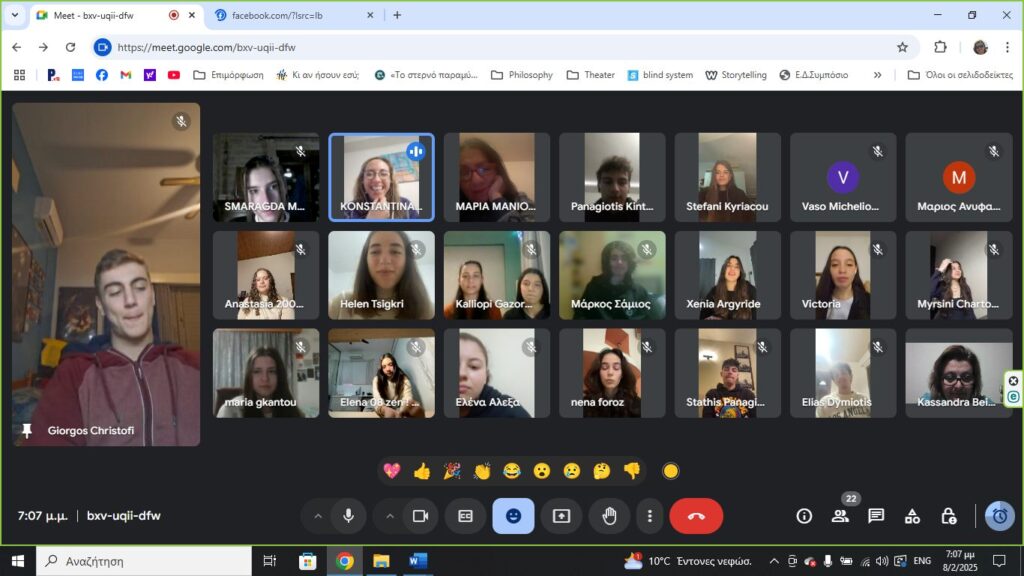 Στο πλαίσιο αυτής της συνεργασίας το Σάββατο, 8 Φεβρουαρίου 2025 υλοποιήθηκε διαδικτυακή συνάντηση γνωριμίας των μελών του Ομίλου με τους συμμαθητές/-τριές τους της Κύπρου. Στη συνάντηση αυτή οι μαθητές/-τριες είχαν την ευκαιρία να γνωριστούν καλύτερα, να παρουσιάσουν τον εαυτό και τα ενδιαφέροντά τους, να ανταλλάξουν ιδέες για το έργο κτλ.