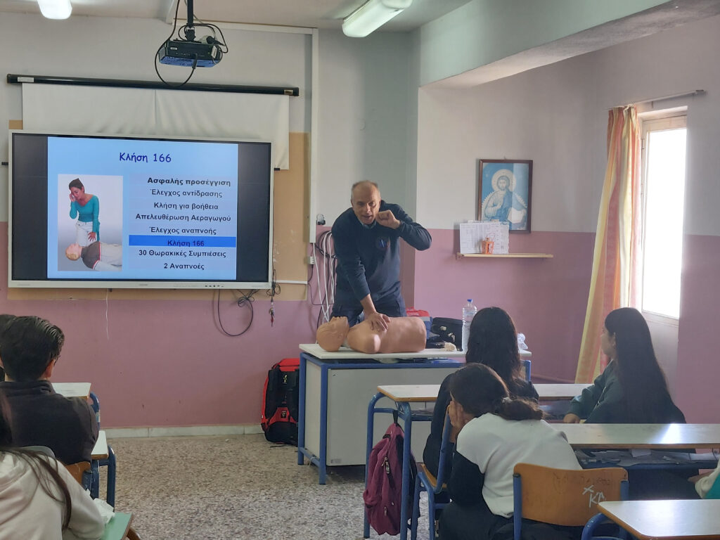 Την Τρίτη 16 Δεκεμβρίου πραγματοποιήθηκε παρουσίαση Πρώτων Βοηθειών στο σχολείο μας και συγκεκριμένα στους μαθητές του Ομίλου Πρώτων Βοηθειών και στο τμήμα Β1 από τον εκπαιδευτή – διασώστη του τομέα Ρεθύμνου του ΕΚΑΒ Κρήτης, κ. Μανόλη Λέκκα στο πλαίσιο δράσεων του Ομίλου για ενημέρωση και ευαισθητοποίηση των μαθητών/τριών σε θέματα υγείας και ασφάλειας.