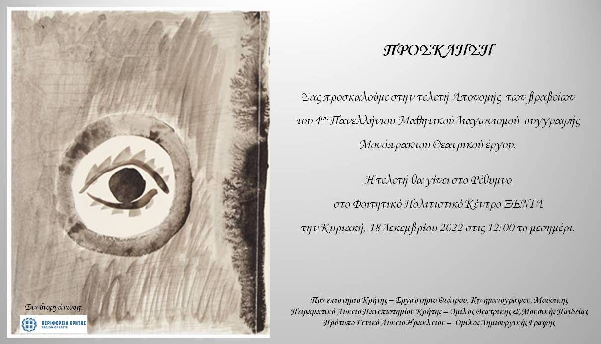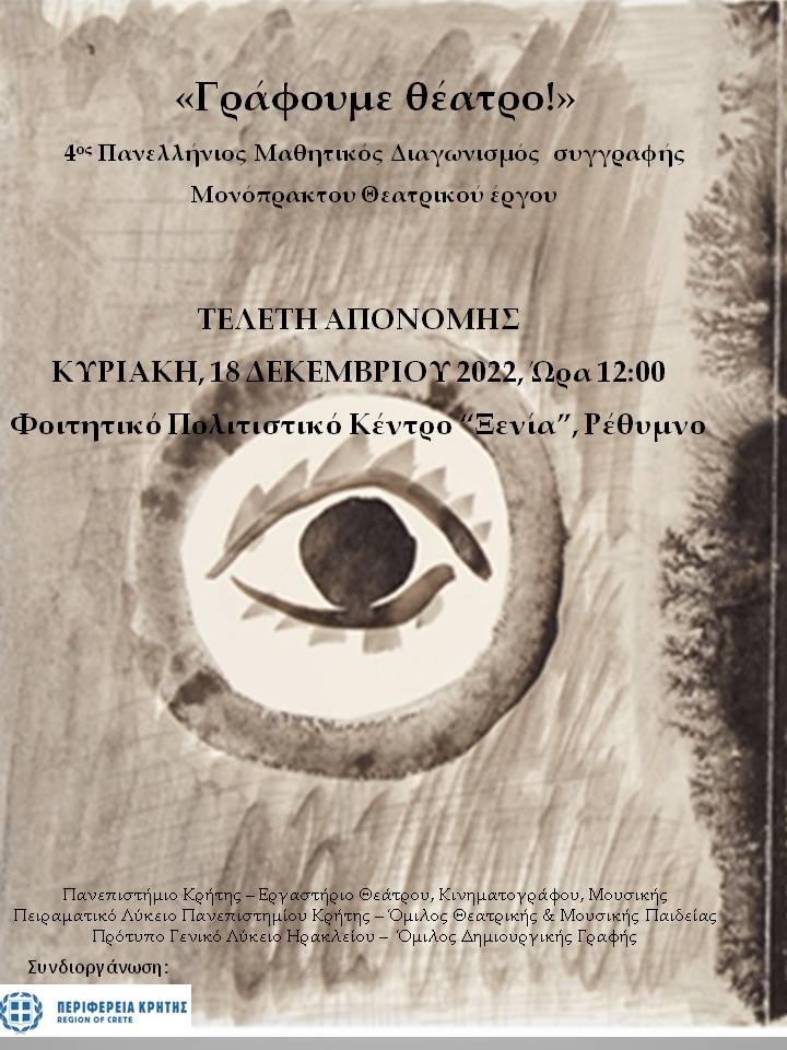 Φτάσαμε αισίως στον 4ο ετήσιο Πανελλήνιο Μαθητικό Διαγωνισμό συγγραφής Θεατρικού Μονόπρακτου. Προσπαθήσαμε να δώσουμε στις πιο ελπιδοφόρες φίλες και στους πιο πολλά υποσχόμενα φίλους του θεάτρου την ευκαιρία να γράψουν τα δικά τους έργα… Να πάρουν μια μικρή γεύση από την εμπειρία της δημιουργικής θεατρικής γραφής… Να επιστρατεύσουν όποιους ήρωες κι όποιες ηρωίδες θέλουν, να τους/τις ρίξουν πρώτα στο χαρτί, για να μπορέσουν κάποτε -το ευχόμαστε ολόψυχα- να τους/τις δουν ζωντανεμένους/ες πάνω στη σκηνή… Κι είμαστε εδώ, για να διευκολύνουμε την επικοινωνία μεταξύ των μαθητών και των μαθητριών που διαθέτουν μια παραπάνω ευαισθησία, ικανή να τους κάνει να γράψουν. Είμαστε εδώ για να τους ενθαρρύνουμε, εξοπλίζοντάς τους με δύναμη και ουσιαστικά εφόδια συγγραφής. Η κινητοποίηση των δασκάλων ή και όλου του σχολείου τους ήταν σε πολλές περιπτώσεις εντυπωσιακή. Η συλλογικότητα αναδεικνύεται ένα νέο στοιχείο της συγγραφής, εκεί που νομίζαμε ότι ζούμε σε μια σκληρή ατομικιστική εποχή. Κι αυτό δείχνει να είναι το πιο ελπιδοφόρο μήνυμα του διαγωνισμού μας.